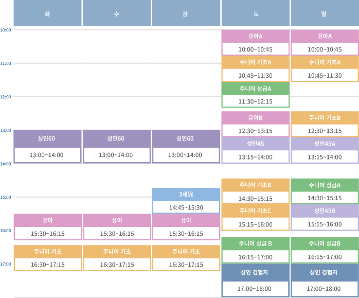 신청은 여기현재 성인 45는 모든 클래스가 웨이팅 인원 100명 이상입니다. 안내에 2~3년 정도 걸리므로 이 점 양해하셔서 신청해 주십시오. 또한 웨이팅을 취소하시는 분은 번거로우시겠지만 전화로 신청해 주시기 바랍니다.